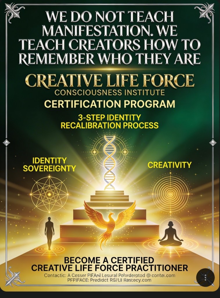 When you complete this certification, you will receive your official diploma from the Creative Life Force Consciousness Institute. You will be recognized as a Certified Creative Life Force Practitioner. You will have the authority to guide others through the three‑step identity recalibration process. You will have the tools to transform lives. You will have the power to shift emotional states. You will have the ability to awaken creators.