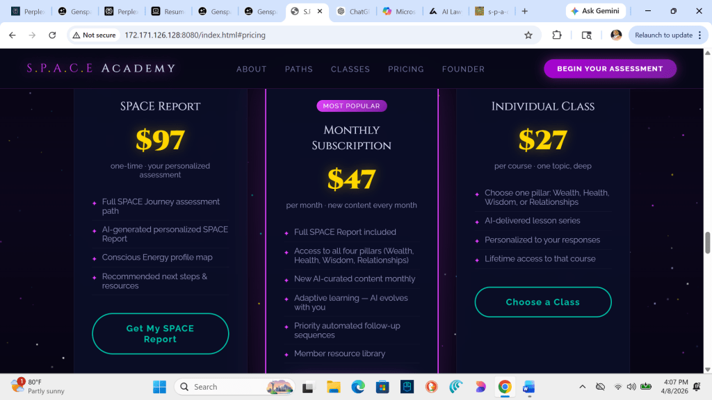 S.P.A.C.E. ACADEMY is built on spiritual clarity, psychological depth, and energetic truth. Thousands of hours of research, testing, and refinement have gone into creating this system. It is designed to help you understand yourself at the deepest level and elevate your conscious energy in a measurable, meaningful way.